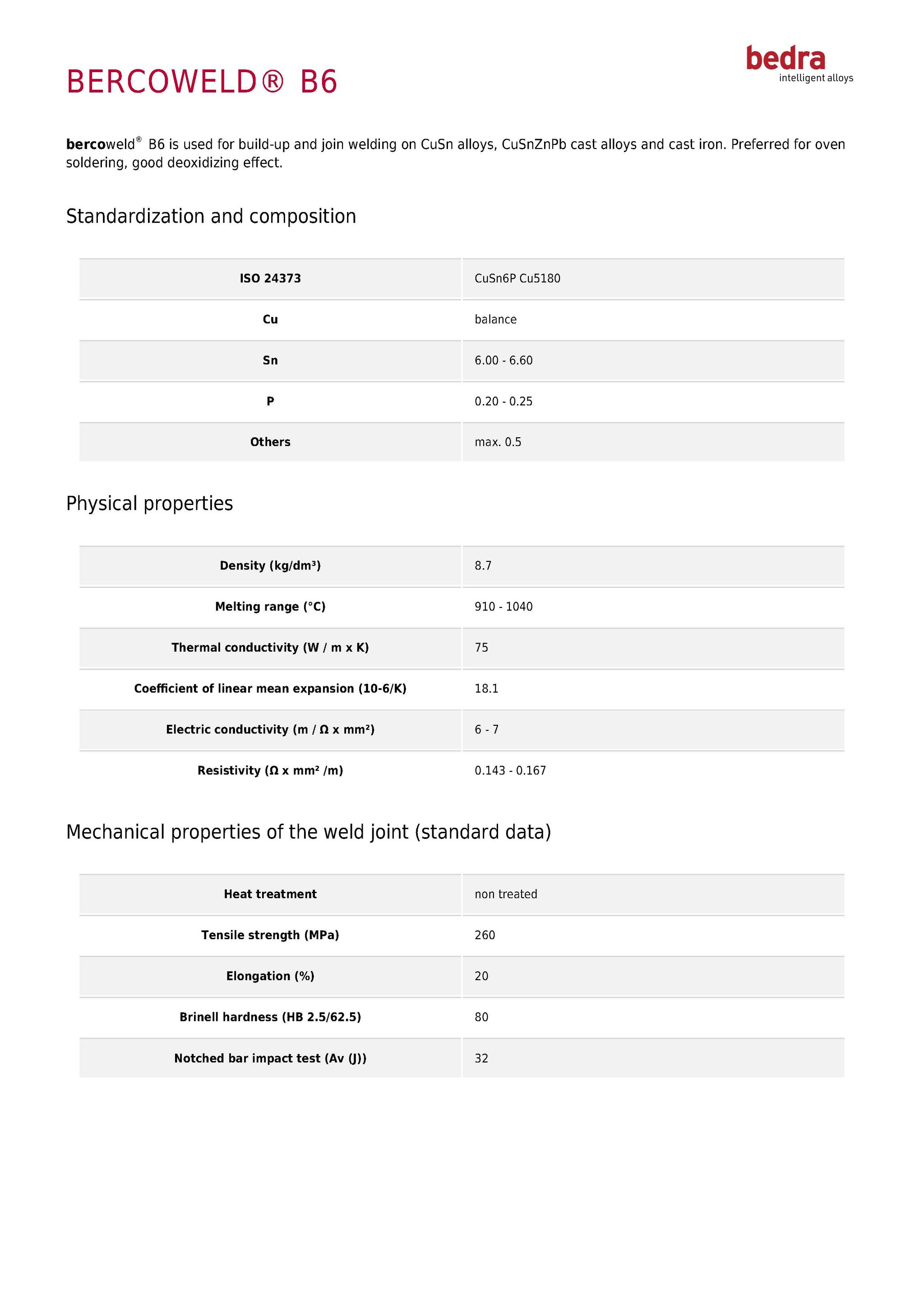 bercoweld® B6は、CuSn(すず青銅)合金、CuSnZnPb鋳造合金(鉛入りすず青銅)、および鋳鉄の肉盛り・接合溶接に用いる溶加材です。炉中ろう付けに特に適しており、強い脱酸作用により清浄で健全な継手形成に寄与します。