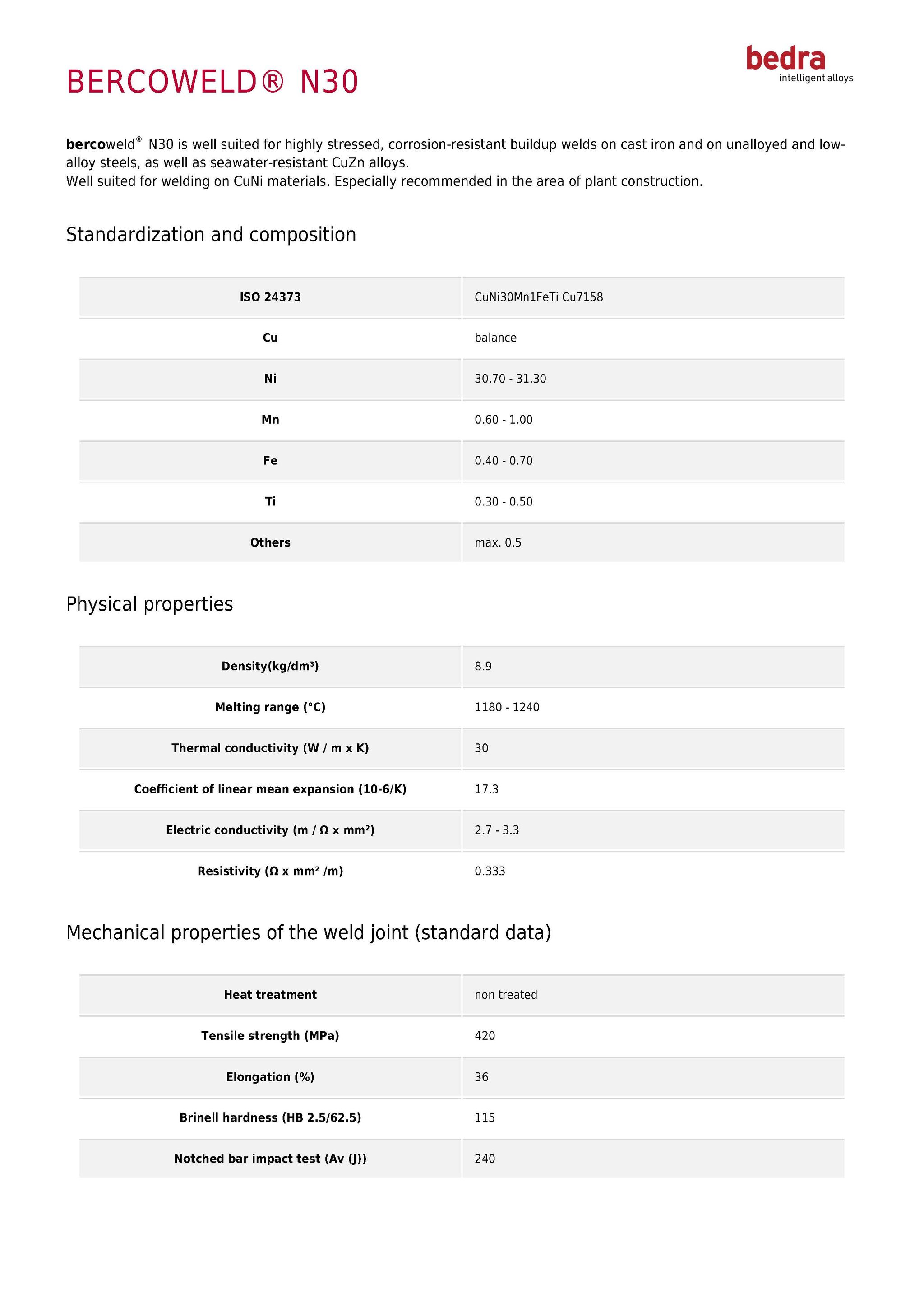 bercoweld® N30は、鋳鉄、非合金鋼および低合金鋼、耐海水性CuZn(黄銅)合金への耐食性肉盛り・オーバーレイ溶接に適しています。CuNi(銅ニッケル)材の溶接にも好適で、プラント建設・保全分野に特に推奨されます。