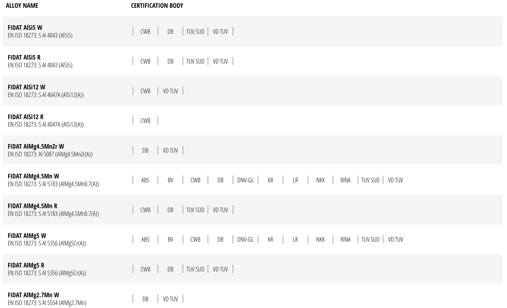 - *FIDAT AlMg4,5Mn W(5183)については、LR・KR・NKK の承認は EN ISO 14175 – I1 に加え EN ISO 14175 – I3 シールドガスでも有効です。